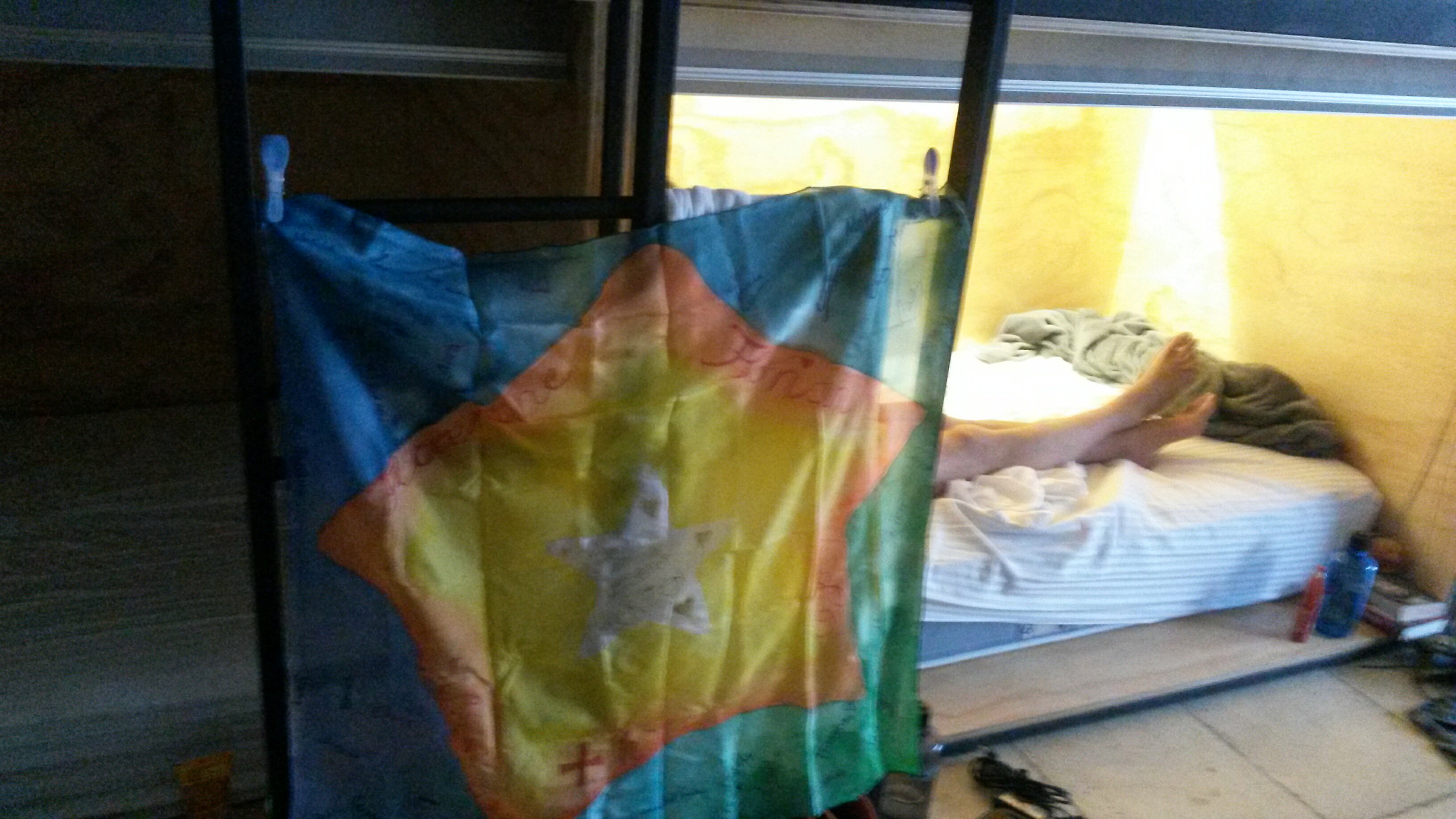 Zum Abschied haben wir von unseren Freunden ein bunt bemaltes Seidentuch bekommen, das uns, egal wo wir sein werden, ein Zuhause bieten wird. Mit all den Unterschriften sind reisen nun alle mit uns mit. Was für eine wundervolle Idee.