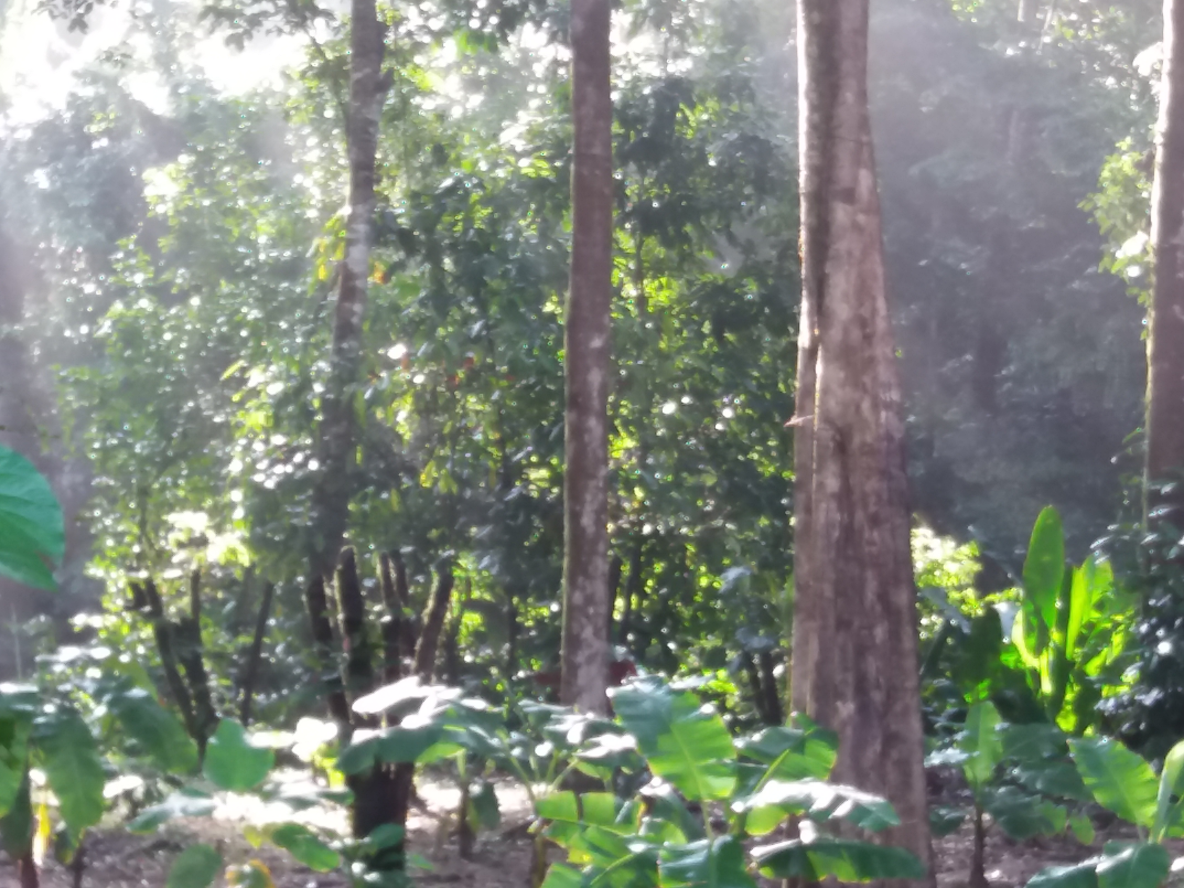 Der ist völlig anders als sonst bei uns. Alles richtet sich nach dem Wetter und dem Tageslicht. Hell wird es um 5.00 Uhr. Daher stehen wir recht früh auf. Das Frühstück ist einfach: entweder gibt es amerikanische Pfannkuchen, die aus einem Pulver mit Wasser angerührt werden. Die Pappversion, die wir bereits aus dem Mirador kennen. Manchmal gibt es auch Reis und Nudeln. Unsere Arbeit beginnt dann nach dem Frühstück bis so zum Mittagessen. Je nachdem, was anfällt. Heute haben wir die Bananenplantage, die für die Tapire als Futterquelle, angebaut wurde, von Zweigen und Ästen befreit. Nach der Tour im näxhtlichen Dschungel war ich froh über die Handschuhe und dass wir Gummistiefel trugen, denn wir sollten besonders auf Spinnen und Schlangen acht geben. Silas und Cayo fingen auch eine recht große Kröte. Herso schlug mit seiner Machete dann noch eine weitere Schleuse, die später ein Pfad werden soll. Bei Cayo hatten sich einige Ameisen in seine Gummistiefel veriirt und bissen ihn. Das tut wirklich total weh und ich verarztete ihn dann in der Hütte auf der Plattform. So war meine Arbeitstag recht kurz. Ich blieb bei den Kindern auf der Plattform während Flo mit Herso weiter arbeitete und neue Kokosbäume pflanzte. Ich kümmerte mich um das Mittagessen. Herso war rundum glücklich, dass jemand für ihn etwas kochte und es schmeckte ihm demenstsprechend auch so wichtig gut. Ich nahm die Herausforderung an, zu waschen. Unten in der kleinen Hütte. Dort gab es auch etwas Wasser. Ich nutzte den Sonnenschein für ein erstes Vortrocknen auf der Wäscheleine zwischen den Bananenbäumen. Bereits beim Mittagessen fing es wieder zu regenen an und dauerte die ganze Nacht. Ich bin mal gespannt, wie viele Tage es dauert, bis die Wäsche so einigermaßen trocken ist. Nach dem Essen bleibt nicht so viel Zeit, um etwas zu machen. Es gibt in der Nähe einen Fluss, in dem man baden kann. Wenn der Regen einsetzt und das ist immer ziemlich stark, dann bleibt uns nichts anderes übrig, als auf unserer Plattform zu verweilen. Wir lesen viel, lernen Spanisch, schreiben Tagebuch oder Blogbeiträge oder oder. Oft setzt dann noch ein Tropengewitter ein, was recht laut und heftig sein kann. Wenn es dann dämmert, so gegen 17.00 Uhr fliegt oft eine Fledermaus durch die Plattform, das ist schon irre. Und abends auf dem Weg zum WC ist uns bereits mehrmals ein riesiger Frosch begegnet: Um 18.00 Uhr ist es hier stockdunkel und hier gibt es für die Plattform nur eine einzige Glühbirne, so dass man nicht mehr allzu viel machen kann. Daher ist meistens um 19.00 oder spätestens 20.00 Uhr Zeit fürs Bett.
