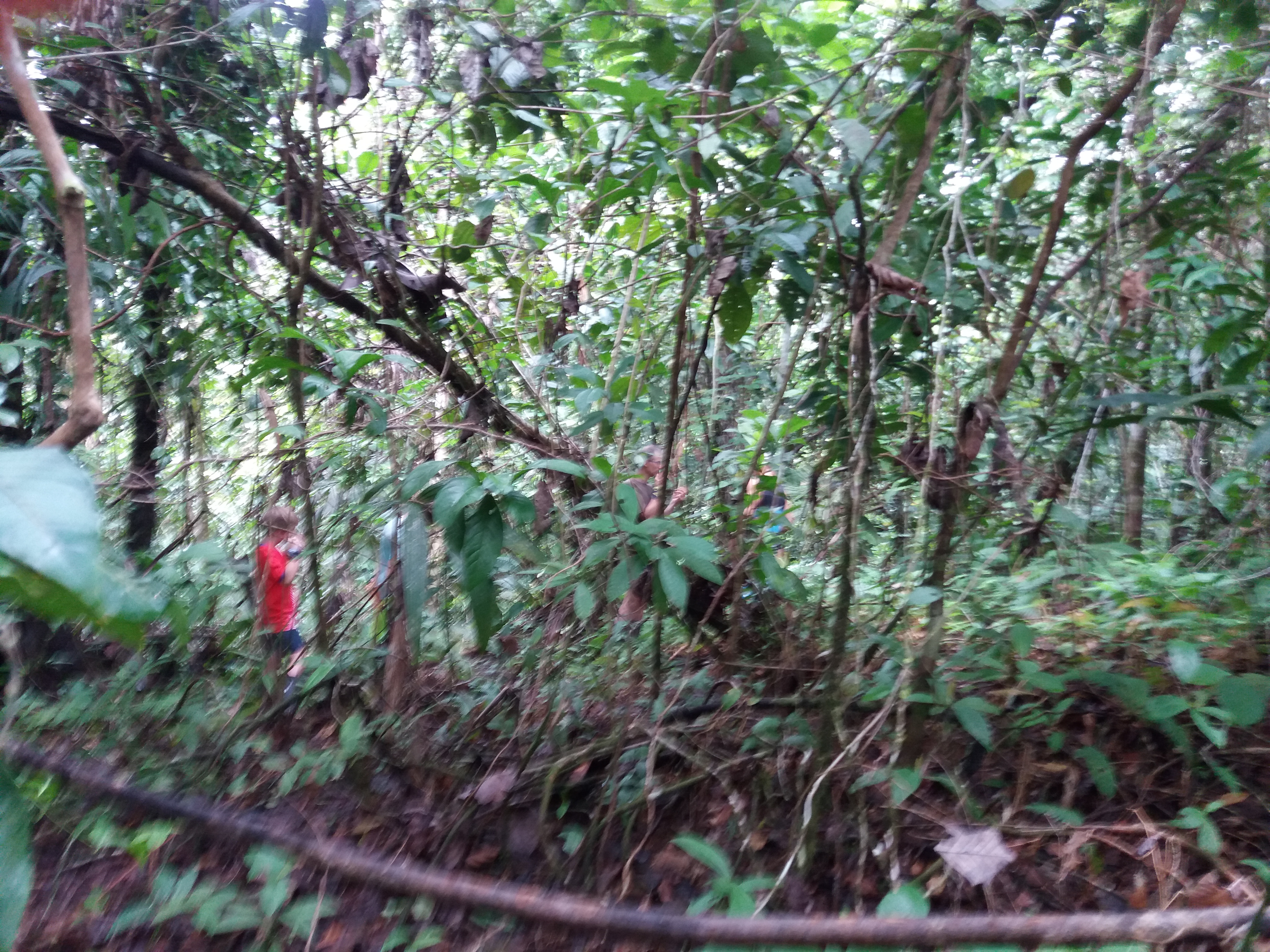 Schließlich wurde ich von der Fegerei erlöst und wir machten uns zu 5 auf, um dünne Bäume zu schlagen, aus denen ein Geländer gebaut werden soll. Auf dem Weg fällt Herso noch einige morsche Bäume: entweder einfach mit der Hand oder er machte Baum-Karate, indem er gegen den Stamm trat. Sehr beeindruckend! Wir aßen frische Guaven vom Baum, bekamen indisches Zuckerrohr serviert (lecker nach dem anstrengenendem Fegen) und es wurden uns viele Dinge zu den Pflanzen und auch Insekten erklärt. Eine wirklich spannende Tour (die auch wieder sehr viel bergauf und bergab ging). Ich glaube, die Zeit hier im Dschungel wird eine Fitnessherausforderung für mich werden. Immerhin habe ich einen Stock bekommen, so dass ich bei den steilen Abhängen nicht mehr so zittern muss, dass ich ausrutschten könnte. Die Jungs sind dann Querbeet durch den Dschungel. Ich wartete auf dem Weg. Nach einer Weile bin ich zu Tode erschrocken, als es plötzlich dicht hinter mir laut brummte. Vorsichtig drehte ich mich um und sah in 30cm Entfernung einen wunderschönen, grün glitzernden Kolibri fliegen. Als ich mein Handy zückte, war er schon wieder weg.