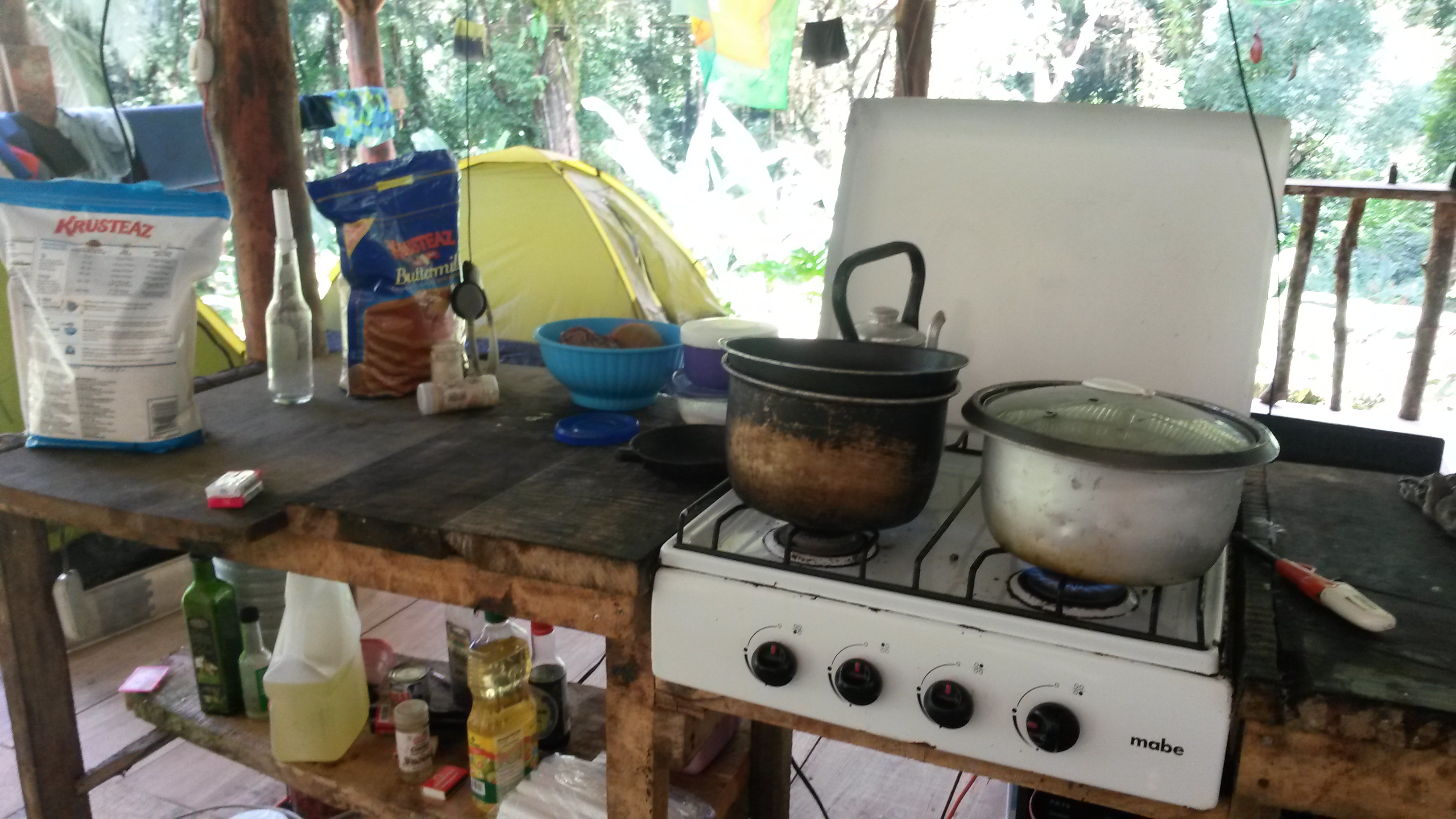 Kokosnuss öffen. Eine Hälfte dann kleinschaben bzw. reiben. Dazu gab es hier eine selbstgebaute Raspel. Wenn man beide Kokosnusshälften geraspelt hat, wird etwas Wasser zugegeben und man wartete ein wenig. Dann Wird die Masse durch ein grobes Tuch gedrückt und fertig ist die Kokosmilch. Die restlichen Kokosbrösel bzw. Flocken können wieder getrocknet werden und schmecken so oder auch mit ein wenig Zucker vermengt köstlich. Man braucht nie wieder ein Bounty zu essen. Das ist nämlich tausend Mal leckerer.
