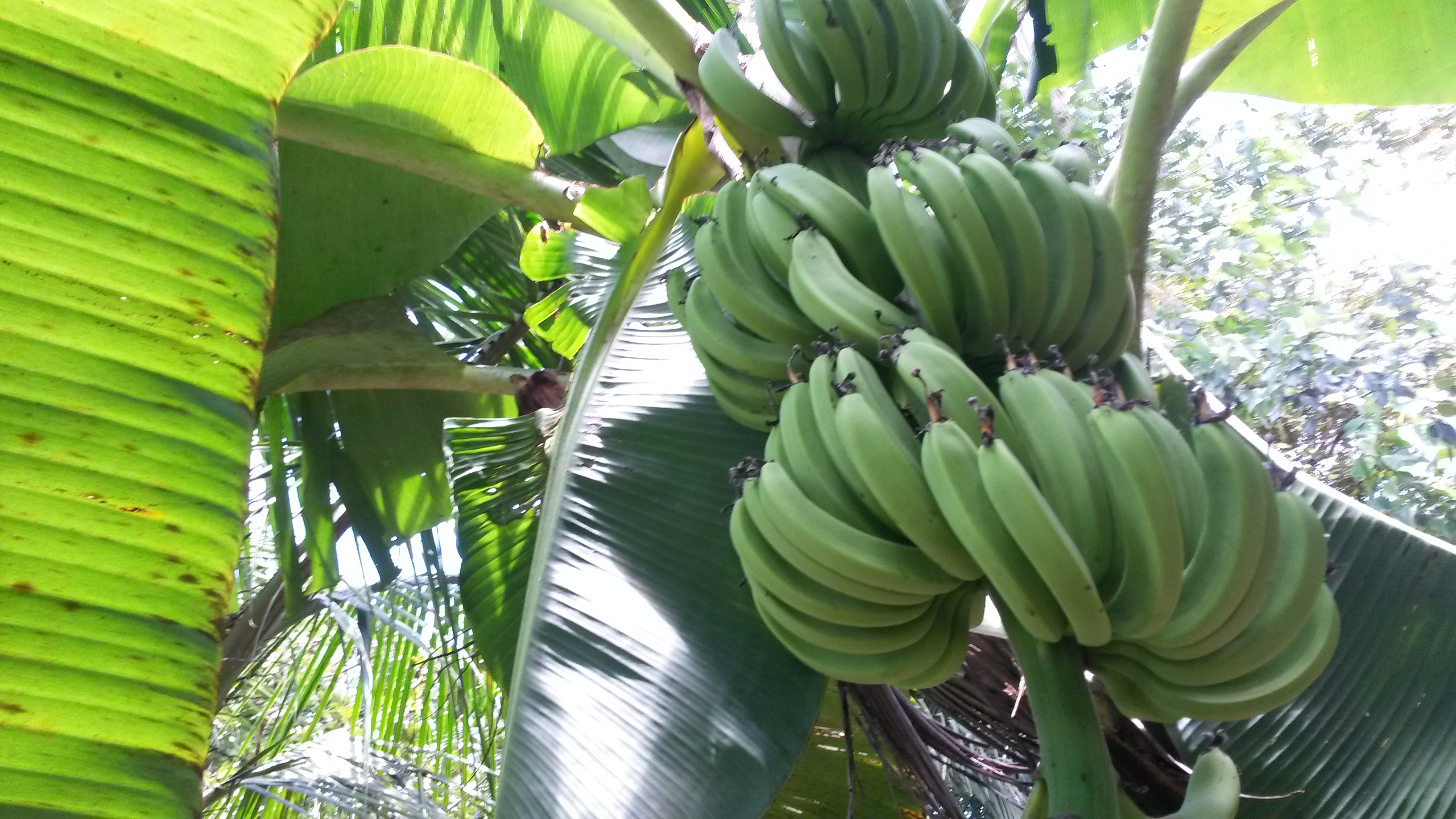 Bis eine Banane reif zum Ernten ist, dauert es zwischen einem und eineinhalb Jahren. Die Banane trägt nur einmal im Leben Früchte. Daher wird bei der Ernte der ganze Bananenstamm abgeschlagen. Seitlich des Stammes hat sich ein kleiner Sprössling gebildet, der wieder Früchte tragen wird.