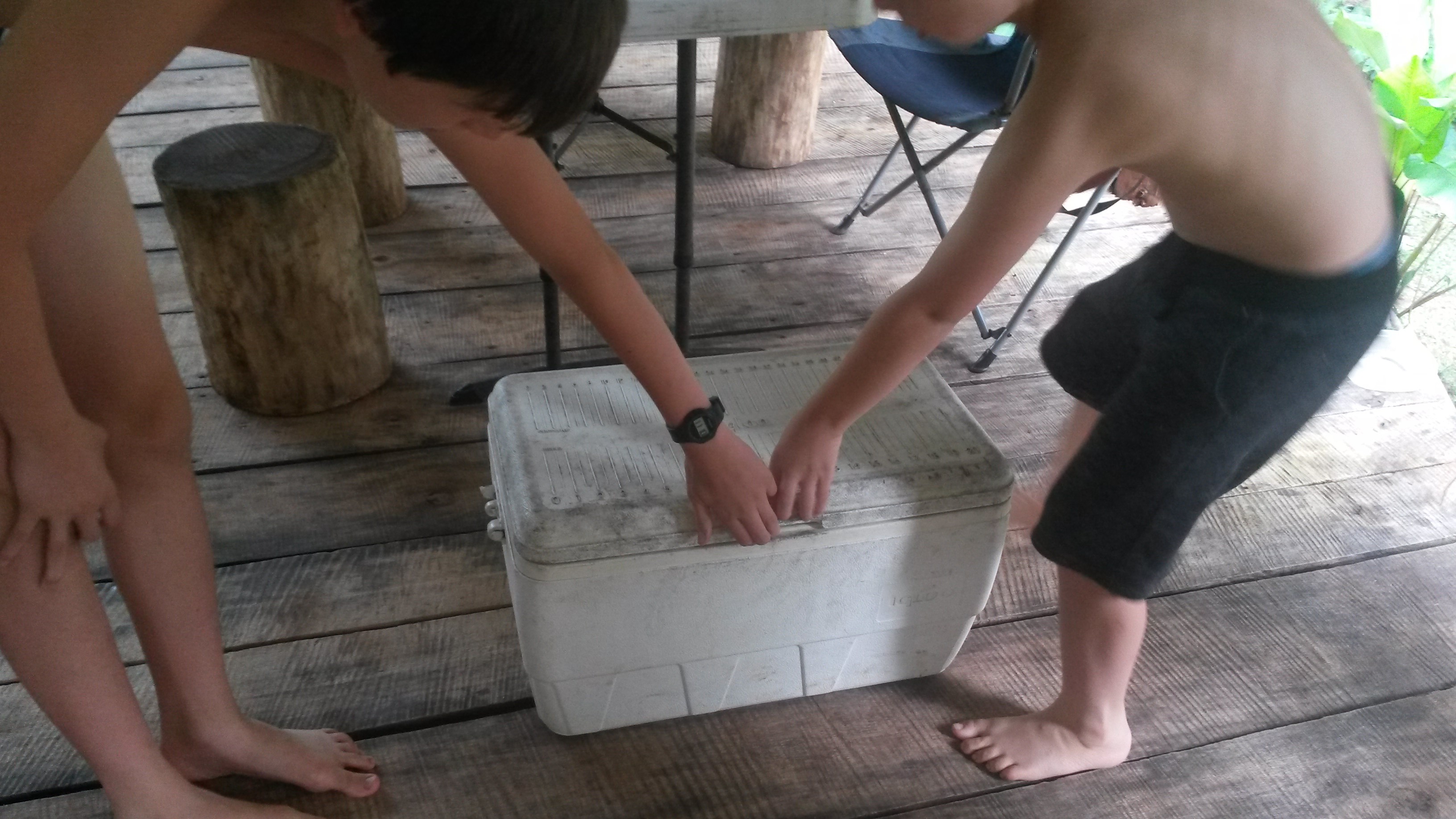 Die gibt es wirklich. Und zwar nicht vergraben in irgendeiner dunklen Ecke, sondern gut sichtbar auf unserer Plattform. Die große weiße Kunststoffbox sind von außen sehr unscheinbar aus. Kein Schatzräuber würde diese Kiste groß unter die Lupe nehmen. Für uns ist sie jedoch essentiell. Denn in der Kiste werden all die Lebensmittel aufbewahrt, die nicht nass / feucht werden dürfen und die nicht von irgendwelchem Getier angenagt werden soll. Und zudem ist sie sehr gut als Hocker zu verwenden, denn auf der Plattform gibt es nur 5 Sitzgelegenheiten.
