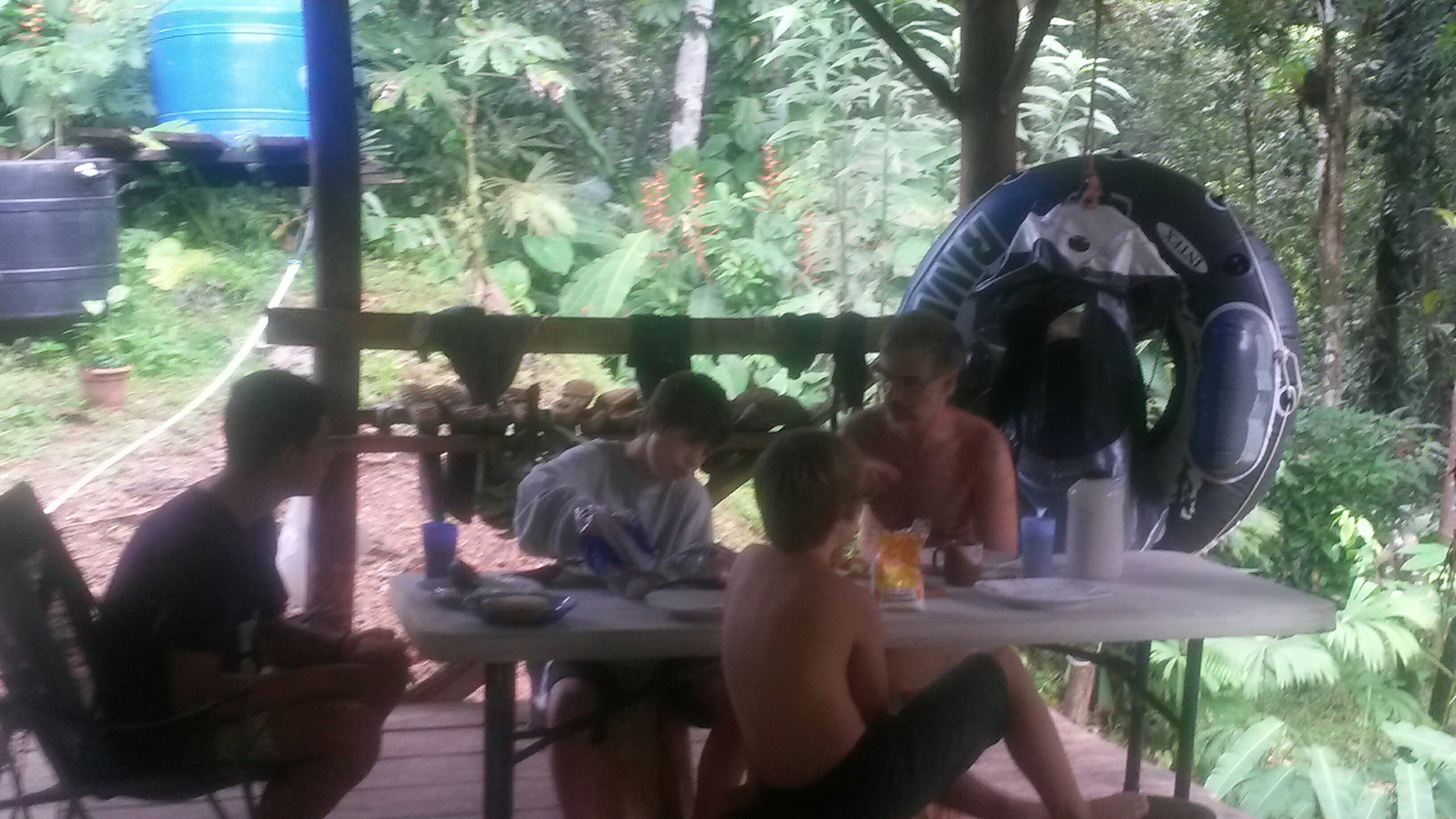 Nach der Nacht mit der Schlange, die sich unter der Plattform eingenistet hatte, waren wir zum einen wieder froh, in die Zivilisation zu kommen, andererseits haben wir alle Herso wirklich sehr ins Herz geschlossen. Und so fiel uns der Abschied doch sehr schwer. Wir machten zum Abschied deutsche Pfannkuchen, nachdem Herso die ganze Zeit über die amerikanischen Pancakes aus der Fertigmischung für sich zum Frühstück gemacht hatte und alberten nochmals ausgelassen herum. Um uns zum Dorf begleiten zu können, hatte er extra seinen Schwager engagiert, zu kommen, da die Plattform nicht unbeaufsichtigt gelassen werden durfte. Cayo hatte ein Bild für Herso gemalt und wir hatten ihm einen langen Dankesbrief geschrieben. Zum Abschied schenkten wir ihm den Weltempfänger, den wir auf unserer Reise nicht verwenden konnten. Wir hatten einmal ausprobiert und Herso war begeistert über den tollen Empfang des Radios. Wir denken, dass er bei Herso in guten Händen ist und ihm viel Freude bereiten wird. Er war ganz gerührt und schenkte den Jungs im Gegenzug eine Angelschnur.