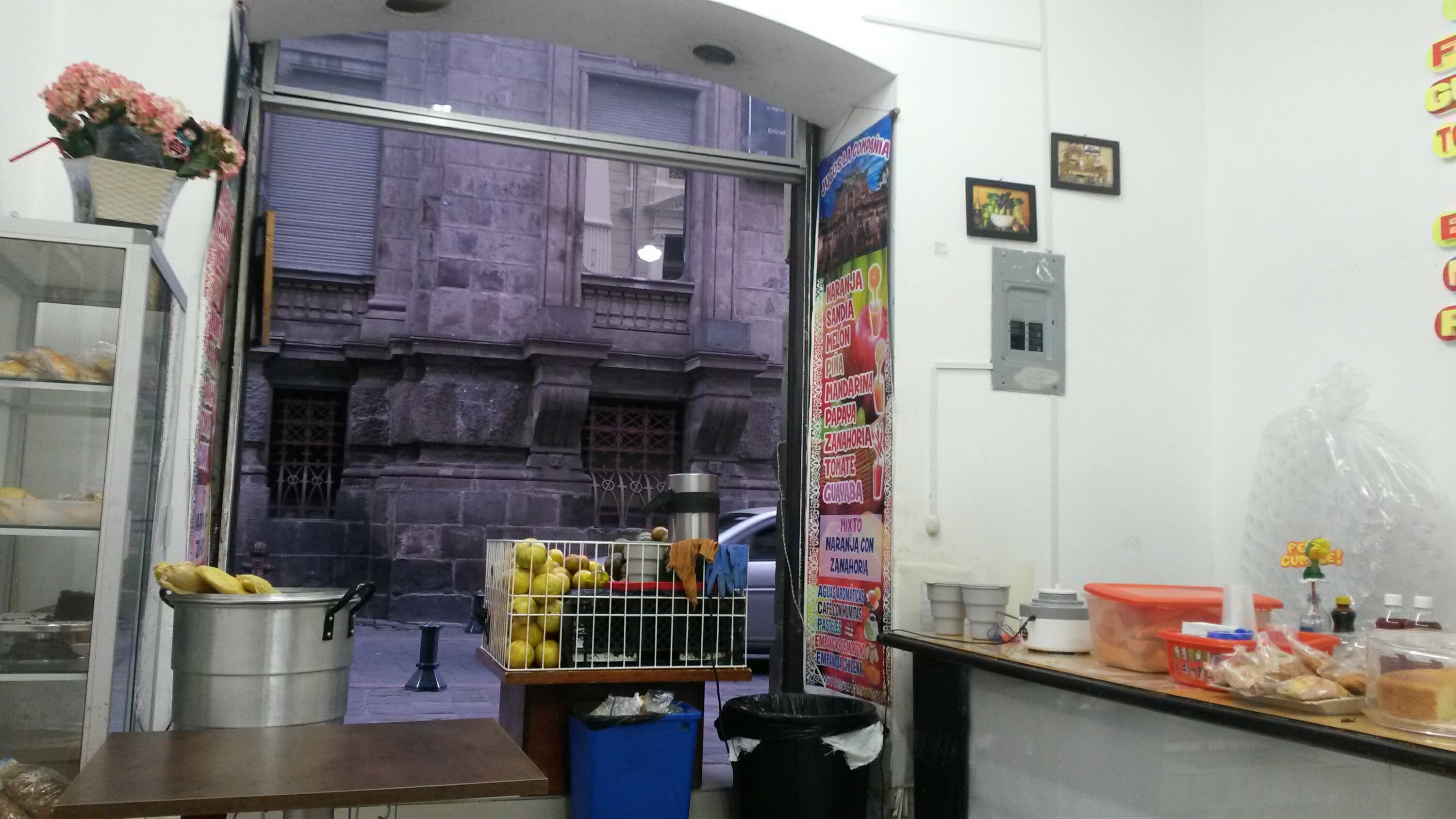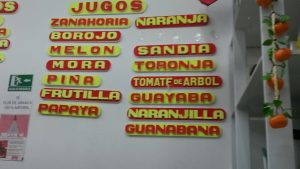 In der Altstadt haben wir einen winzigen Saftladen entdeckt, dessen Hauptgeschäft frisch gepresste und zubereitete Säfte for-to-go sind. Hinter der Saftpresse geht es in den winzigen Raum. Da wir vom Schlendern müde waren, setzten wir uns an einen der beiden Tische (mehr gibt es da nicht) und überlegten uns, was wir denn probieren wollten. Da wir auch Hunger hatten, bestellten wir noch Empanadas. Die Auswahl der Säfte fiel uns schwer. Zum einen war die Auswahl so groß und zu, anderen kannten wir manche Früchte überhaupt nicht.