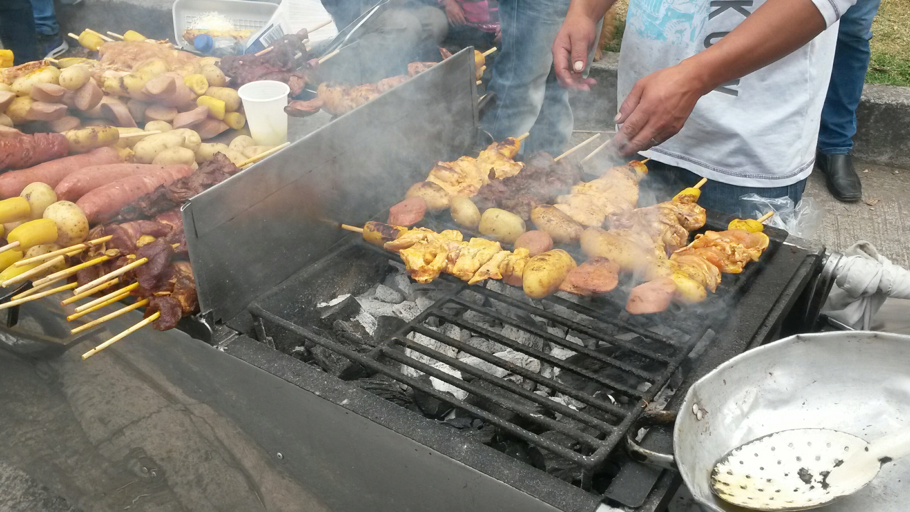Es gibt einfach alles: vom Mini-Grill mit Würstchen, über Kuchen, Saft, Kaugummis, Zuckerwatte,….. Wir erinnerten uns an unsere Reise vor 20 Jahren, als wir in Bolivien von der Straße super leckere Fleischspieße gegessen hatten. So ähnliche Spieße sahen wir auch und mussten natürlich gleich probieren… Lecker.