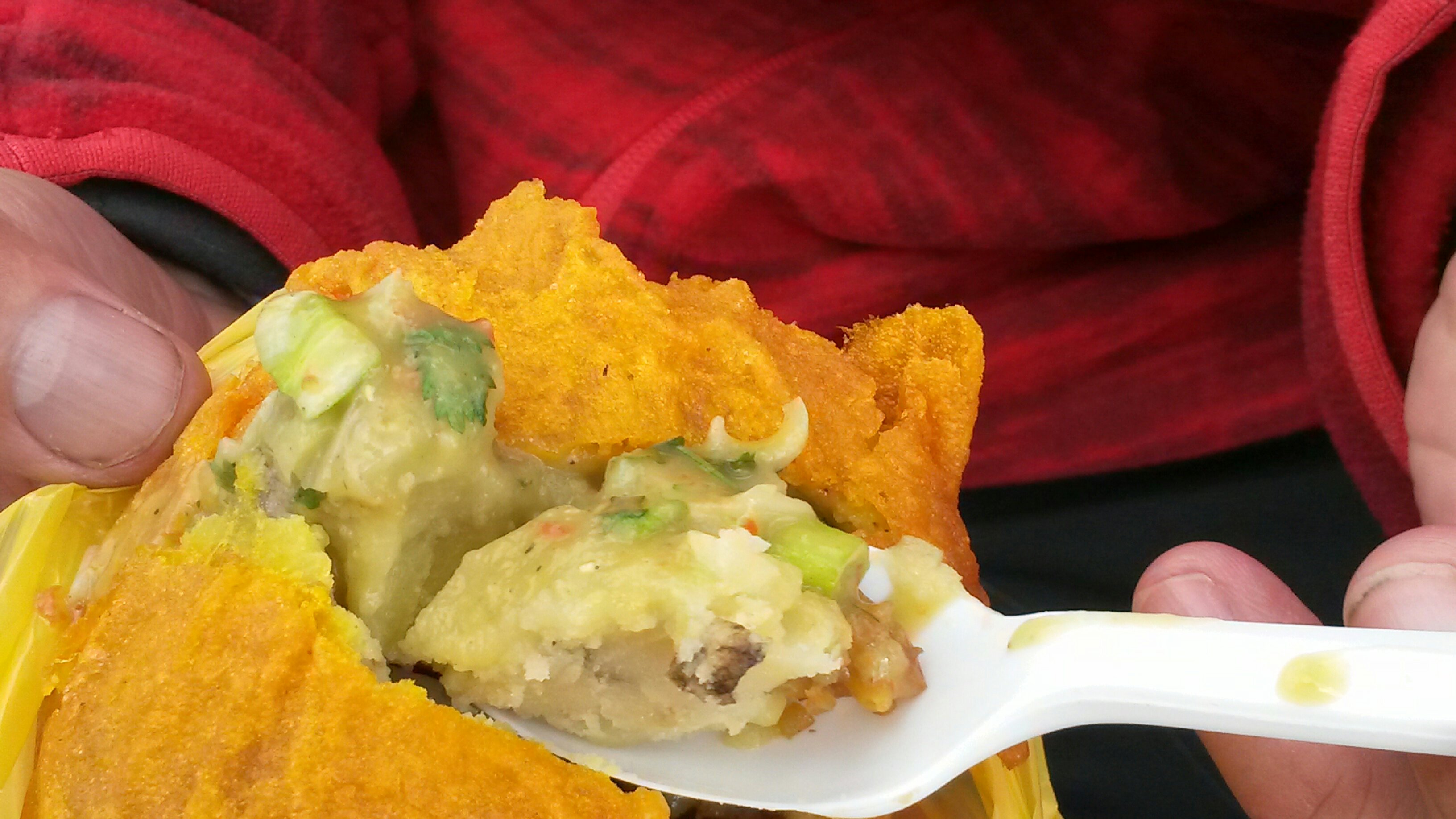 Eine Sache interessierte uns besonders. Der Mann am Stand verkaufte runde frittierte Kugeln, die mit dem Löffel aufgemacht wurden. Sah lecker und interessant aus. Probeweise teilten wir uns zu zweit eine Kugel. Neben den Kugeln war eine Schale mit einer Sauce und Flo fragte, ob die auch dazu gehöre. „Die ist aber scharf“. Wenn schon, denn schon. Vorsichtig kam noch etwas von der Sauce drauf. Eine gute Entscheidung. Die Kugel schmeckte so etwas von lecker und ist quasi ein Mittagessen to go. Außen ist Kartoffelbrei und innen eine Füllung mit Reis, Ei, Gemüse und Fleisch. Das ganze ist wie gesagt, gebacken und knusprig. Die Sauce gibt allem noch einen scharfen Geschmack. Mein neuer Favorit hier auf der Straße. Wie das nun heißt habe ich noch nicht so ganz herausgefunden. Kommt noch. Wir sind ja noch ein paar Tage hier und werden bestimmt nochmals solche Kugeln essen.