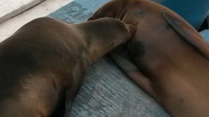 Seelöwen liegen faul am Pier und lassen sich die Sonne auf ihr Fell brennen, während im Wasser eine ganze Schar von kleinen und großen Meeresrochen durch das Wasser fliegt.
