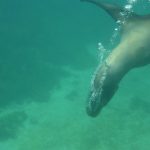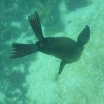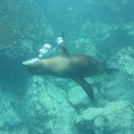 Wir fuhren erst zu den Felsen, auf denen die Seelöwen sind. Als wir im Wasser waren, schauten kurz 2,3 Seelöwendamen vorbei, sie waren dann aber auch schnell verschwunden. Bei Santa Fe waren auch recht viele Boote unterwegs, dort ist die Anzahl der zugelassenen Boote erheblich größer. Da die Seelöwenmännchen damit beschäftigt waren, ihr Revier gegen junge Seelöwen-Männchen zu verteidigen, waren nicht viele Seelöwen-Weibchen im Wasser und wir hielten Abstand von den Männchen, da sie gefährlich werden konnten, wenn man ihnen zu nahe kam. So haben wir leider nicht allzuviel von den Seelöwen im Wasser gehabt.