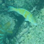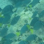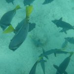 Schon von außen, bevor wir ins Wasser hüpften, konnten wir viele bunte Fische sehen. Dieses Mal schnorchelten wir in tieferem Wasser und sahen jede Menge größere Fische. Ganze Schwärme von Doktorfischen, richtig große Papagaienfische, einen großen Weißspitzenriffhai, der schlafend am Meeresgrund lag und etliche Rochen. Faszinierend und auch respekteinflößend, wenn sie so durch das Wasser fliegen. Ich genoss es wieder mit den Schwärmen zu schwimmen und machte die Erfahrung, wie es ist, gegen den Strom zu schwimmen. Ein merkwürdiges Gefühl, wenn einem ein Fischschwarm entgegenkommt. Nach der Mittagspause mit superleckerem Ceviche ging es nochmals ins Wasser. Es ist einfach unglaublich, wie viele verschiedene Fische hier herumschwimmen. Mathias hatte uns eine Übersicht mit den meisten Fischen, die auf Galapagos vorkommen, geschenkt, so dass wir nachsehen konnten, was wir alles gesehen hatten.