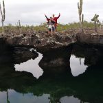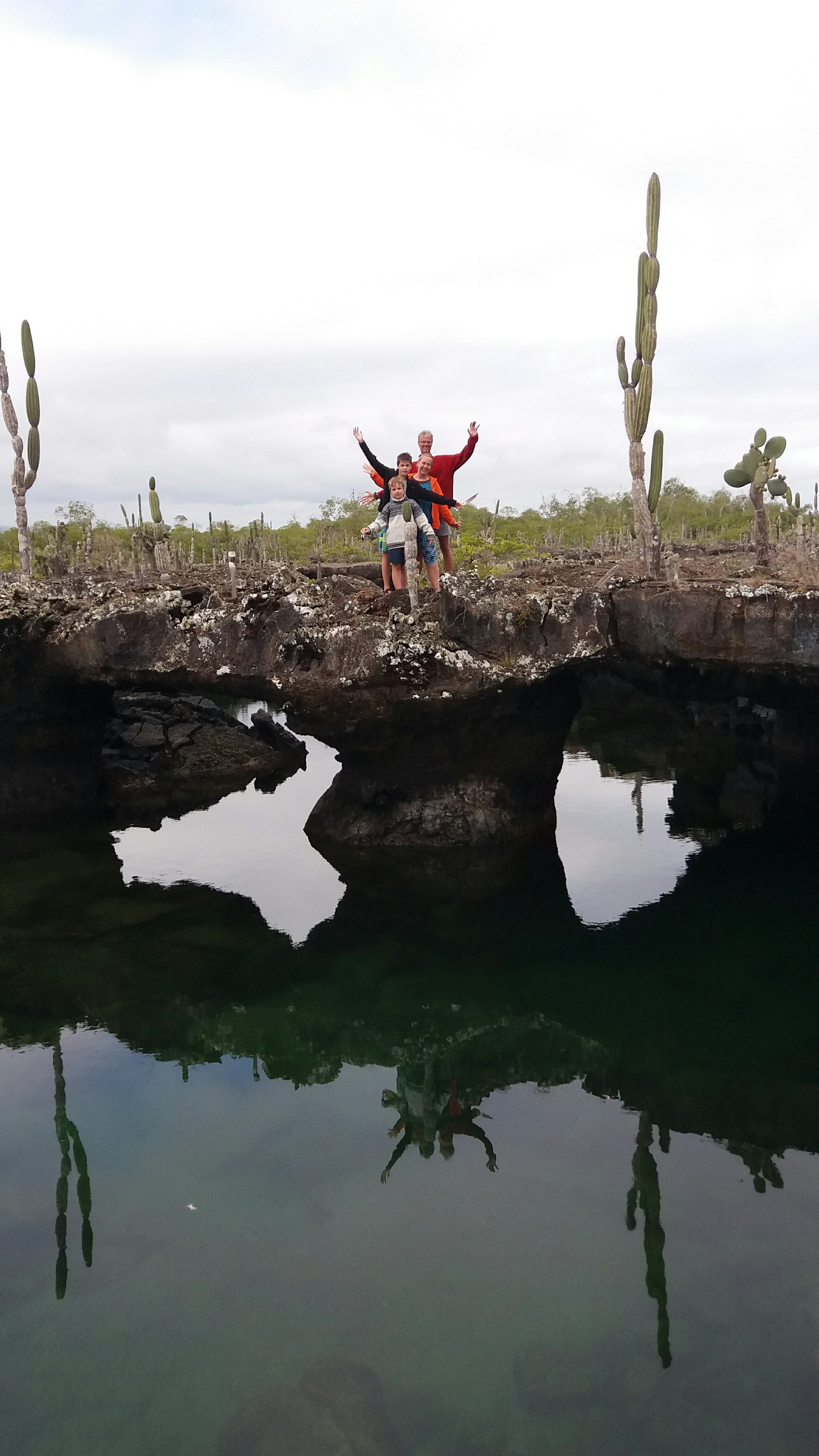 Nach dem Schnorcheln, wir waren echt trotz Neoprenanzüge, durchgefroren (das Wasser war wirklich richtig kalt!) fuhren wir mit dem Boot weiter in die Lavaformationen hinein. Das Lava hatte sich hier zu Brücken geformt (tunneles), es sah aus wie in Venedig. Auf den Lavafelsen standen riesige Kakteen und das Wasser war glasklar. Vom Boot aus konnten wir ganze Schwärme von Doktorfischen sehen, Meeresschildkröten schwammen umher, wir sahen einen riesigen schwarzen Rochen. Das Boot legte an und wir spazierten ein wenig durch diese Landschaft, die so gar nicht von dieser Welt aussah. Da das Wasser so klar war, spiegelten sich die Lavaformationen im Wasser – ein genialer Anblick!