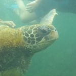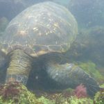 Unser Boot war kleiner als gewöhnlich, da es zwischen den Lavaformationen durchkommen musste. Um zu los tunneles zu kommen, mussten wir über ziemlich hohe Wellen kommen, die sich vor den Lavaformationen brachen. Es war ein richtiges Abenteuer, so über die Wellen zu fliegen, vor allem das harte Aufkommen… Es war gerade Ebbe, eine besonders günstige Zeit zum Schnorcheln. Überall im Wasser sah man die Köpfe der Pazifischen Meeresschildkröte aus dem Wasser ragen. Sie waren riesig! Schnorcheln hier war wieder wie in einem Aquarium. Zuerst schauten wir uns die großen Weißspitzenriffhaie an. Unser Guide zeigte uns ein großes Exemplar. Ich sah es nicht und fragte Silas, der nur lapidar meinte, „hinter dir!“ Als ich ich umdrehte, lächelte mich in 30cm Abstand ein großer Hai an. Ich hatte fast einen Herzschlag. Da das Wasser so seicht war, konnte ich auch nicht wirklich wegschwimmen. Nachdem ich wieder hellwach war, tauchten wir in eine Unterwasserhöhle, in der sich die Haie ausruhten. Einer nach dem anderen streckte seinen Kopf in die Höhle und wurde von 8-10 Haien angelächelt – im wahrsten Sinne des Wortes, da man ihre Zähne sehen konnte. Wir begegneten noch einigen Meeresschildkröten, die wirklich riesig waren, größer als Flo. Ich schwamm mit einer Holländerin etwas von der Gruppe weg, da mir das wirklich zu eng war. Ich hatten eine andere Meeresschildkröte gesehen und beobachteten sie. Was für ein Gefühl, mit diesem riesigen Tier ein Stückchen nebenher zu fliegen. Ihre sanften Augen und das elegante Fliegen durch das Meer waren unglaublich. Die Meeresschildkröten hatten keinerlei Angst, man konnte ihnen beim Fressen der Algen zusehen. Durch ihren flachen Panzer, der sie stromlinienförmiger macht, haben sie im Vergleich zu den Landschildkröten die Fähigkeit verloren, bei Gefahr ihren Kopf einziehen zu können.