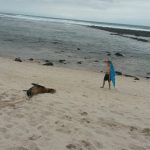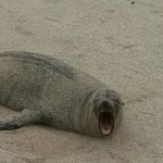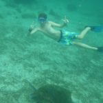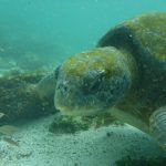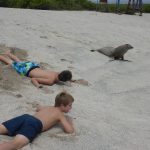 Einen 30-40 Minuten Spaziergang ist die Loberia von der Stadt entfernt. Raus aus der Stadt, am Flughafen oder besser gesagt Flughäfelchen vorbei, immer an der Hauptstraße entlang. Keine wirklich schöne Strecke, dafür ist die Loberia einfach umwerfend. Es geht ein Trampelpfad zum Strand, an dem uns unzählige Seelöwen empfingen. Die lagen überall am Stranf herum. Der Parkwächter am Eingang zum Strand hatte erzählt, dass die Seelöwen gerade alle ihre Babys haben und wir ihnen nicht zu nahe kommen sollten, da sie sonst von ihrer Mutter verstoßen werden könnten. Als wir ankamen waren wir schlichtweg überwältigt. Wir wussten gar nicht, wo wir zuerst hinschauen sollten. Unten am Strand war ein kleiner Kindergarten mit 4, 5 Babys, die miteinander spielten, dann gab es wieder Mütter, die ihre Babys säugten und wieder andere Babys watschelten durch den Sand oder versuchten über die Lavafelsen zu hüpfen, auf der Suche nach der Mama und mit einem lauten Blöken, das sich wie das Meckern einer Ziege anhörte. Am Strand war außer uns niemand. Wir setzten uns hin, schauten zu und staunten. Weiter oben gab es einen Pavillion, der ursprünglich für die Touris gedacht war. Sonnenschutz und eine Möglichkeit, um seinen Rucksack aufzuhängen. Doch statt Touris lagen da in Reih und Glied jede Menge Seelöwen, genossen den Schatten und schliefen. Die Seelöwen schienen uns gar nicht groß wahrzunehmen, sie spazierten ziemlich dicht an uns vorbei. Wir waren ihnen völlig egal. Dann wagten wir uns ins kalte Wasser. Jede Menge Fische konnten wir sehen und viele Meeresschildkröten waren hier. Wir wussten wirklich nicht, zu welcher Schildkröte wir als erstes hinsollten. Wir waren so vertieft ins Schnorcheln, dass wir gar nicht bemerkten, wie wir in eine starke Strümung gerieten. Die Kinder hatten zum Glück Flossen an und kamen so raus. Flo und ich strampelten dich ganz kräftig, bis wir wieder in der sicheren Bucht waren. Es ist jedes Mal aufs Neue einfach genial, ins Meer abzutauchen, in die Blautöne, die Fische zu beobachten und vor allem das Lächeln der Meeresschildkröten zu sehen. Für die Jungs stand fest – das ist der Lieblingsplatz auf San Christobal. Seitlich der Loberia führt noch ein Weg am Meer antlang zu einer Klippe, vorbei an vielen Iguanas und einem atembraubendem Blick. Stundenlang hätten wir den haushohen wellen zusehen können, wie sie brachen, das Gischt sprühte und sich die Farbe des Meeres von dunkelgrünblau in türkisblau wechselte. Ein magischer Ort – das war uns allen sofort klar.