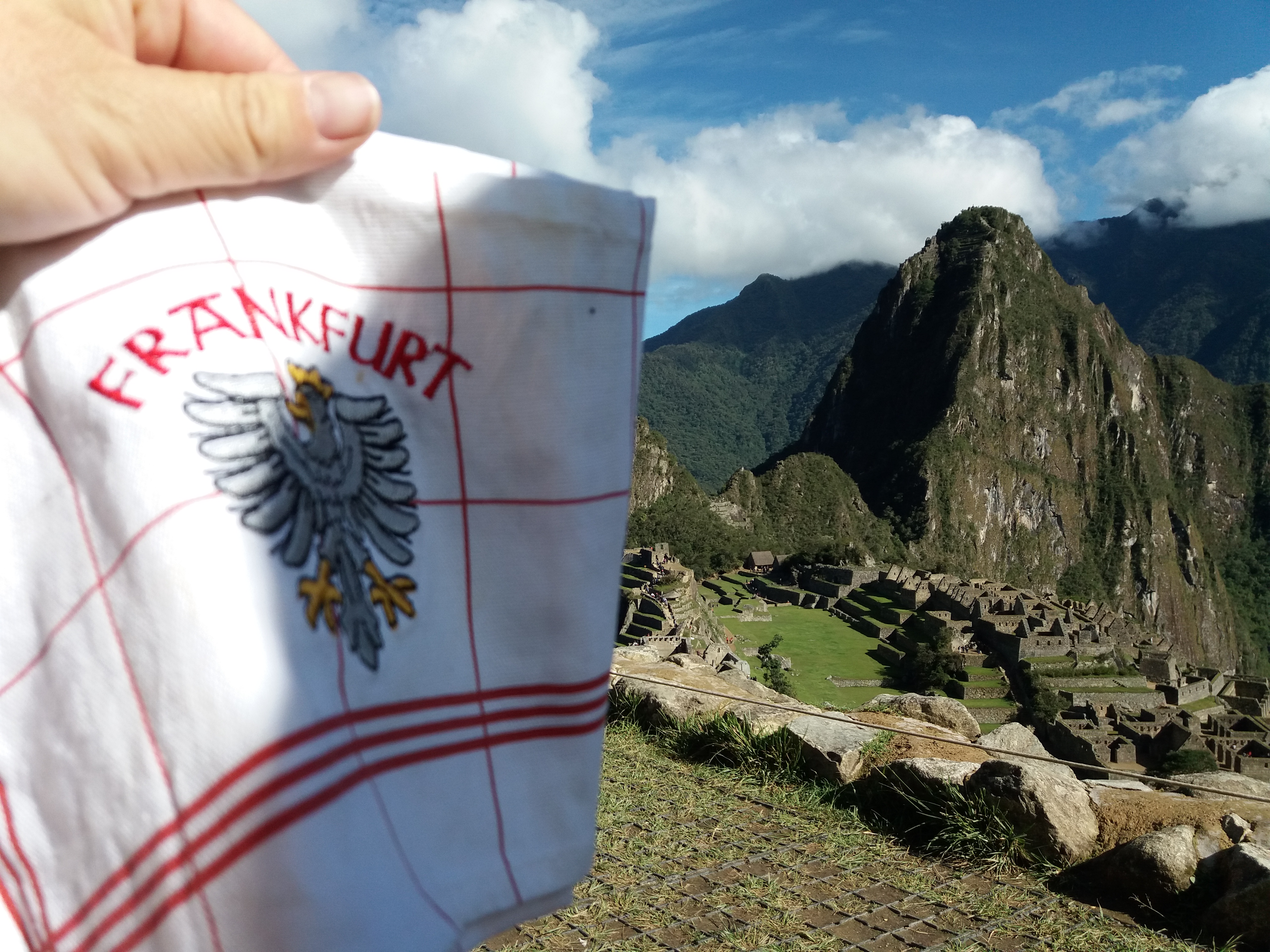 Etwas seltsam fühlte es sich ja schon an, als ich das Frankfurt Wappen aus dem Rucksack holte und vor Machu Picchu entrollte. Was denken denn bloß die Leute? Gar nichts – denn nur kurze Zeit später kam ein Pärchen und entrollte eine riesige kubanische Flagge. So, nun haben wir Frankfurt auch in die Inkastadt gebracht.