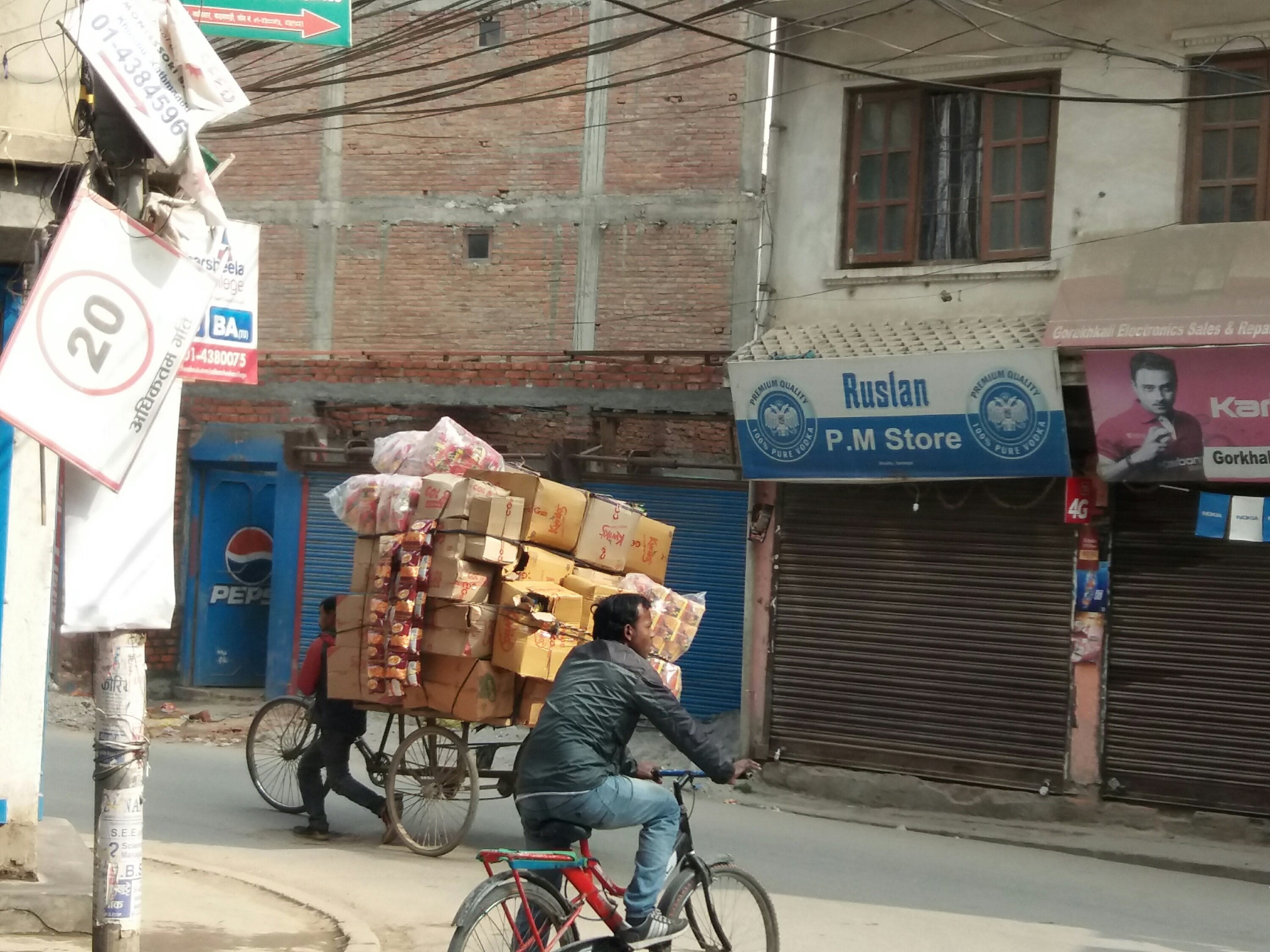 Wenn wir morgens so dasitzen und dem Treiben zusehen, bekommen wir eine Ahnung vom Leben hier in Kathmandu. Da rasen Roller vorbei: Der Fahrer immer mit Helm , die Beifahrer immer ohne. Es ist ungalublich, wie viele Menschen auf so einem Roller Platz haben. Eine ganze Familie passt da drauf. Die Kinder stehen vor dem Fahrer und halten sich am Lenker fest, dann haben hinter dem Fahrer mindestens noch 2 Leute Platz. Es kommen viele leute mit ihren Fahrrädern vorbei, die sie als Obststand umfunktioniert haben. Reisige Drahtkörbe sind hinten auf dem Gepäckträger und auch vorne am Lenker. In den Körben sind Äpfel, Mandarinen, Trauben und Granatäpfel sorgsam aufgestapelt. Die Leute haben immer ihre Waage dabei, eine richtig alte Waage mit zwei Waagschalen und Gewichten. Die Gemüsestände sind dagegen auf einem Wagen mit zwei Rädern, der von den Leuten gezogen wird. Morgens kommen dann die Kinder in ihrer Schuluniform auf dem Weg zur Schule vorbei, im Café sitzen einige Männer und trinken in der Regel Milchtee. Morgens werden hier immer die staubigen Straßen gekehrt und es ist wirklich auffallend sauber im Vergleich zu Afrika, dort lag immer alles auf der Straße herum.