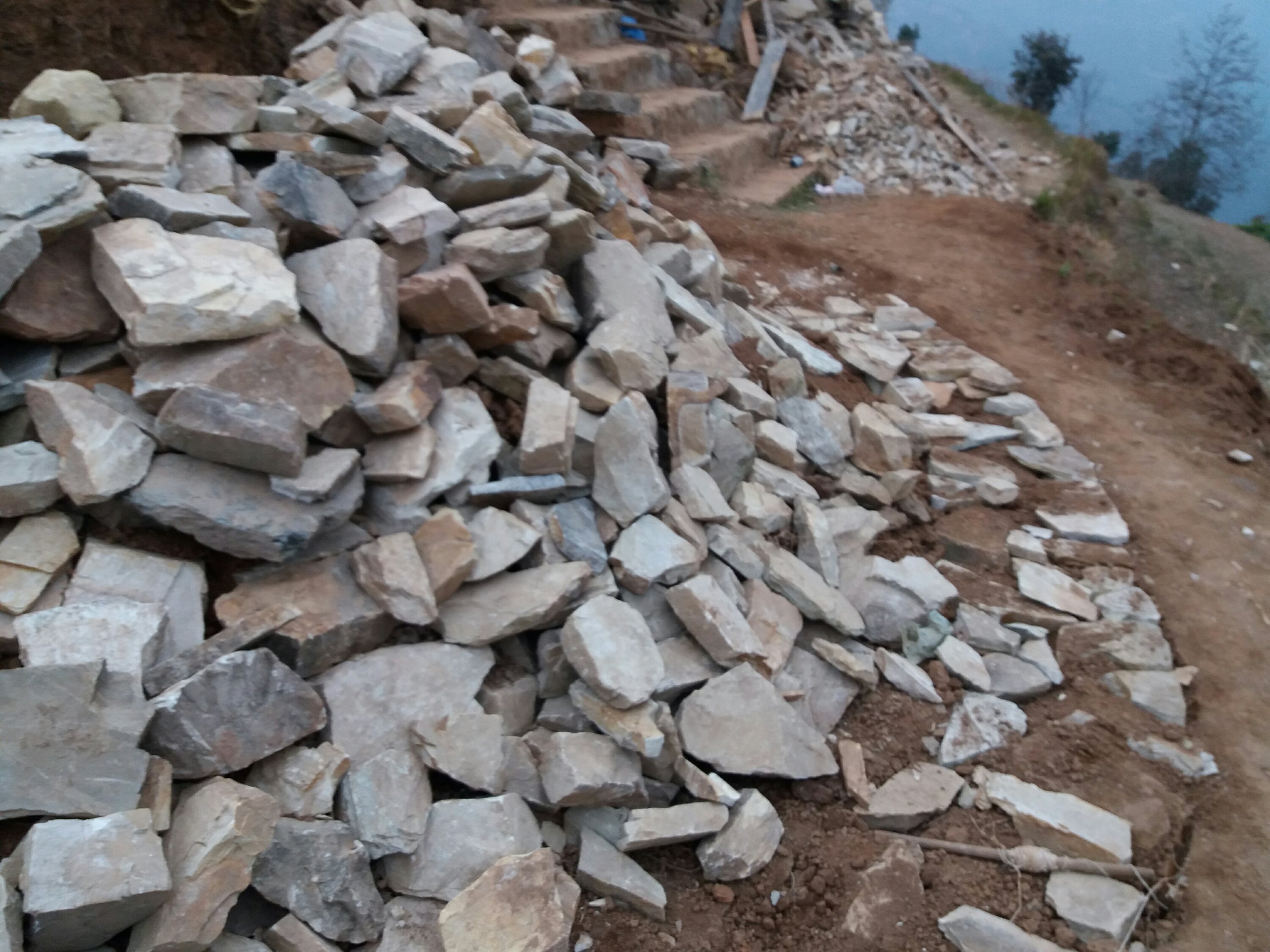 Das nächste große Projekt an der Schule ist der Bau eines Computerraumes. „Es soll etwas Besonderes werden. Die Kinder sollen genug Platz haben, es soll gemütlich sein, mit einem Sofa und die Kinder können dann an den Laptops arbeiten. Shamser hat bereits eine Spenden-Zusage von 10 neuen Laptops aus Singapur. Fehlt „nur“ noch der Raum. Es wird wieder ein nepalisches Steinhaus werden. Zuerst bedeutet das graben: mit Spitzhacke, Schaufel geht es ran. Zum Glück ist Nico ein Supermann, der unbegrenzte Kraft zu haben scheint und in einem fort gräbt und schaufelt. Gefühlt hat er 90% der Arbeit getan und wir restlichen, die 10%. Dennoch haben wir alle am Abend Blasen an den Händen und Rückenschmerzen. Wir wechseln uns ab, wer unterrichtet und wer am Haus weiterbaut. Es steht nun an, dass Fundament zu bauen, d.h. Steine in die gegrabenen Gräben zu schütten. Ein nepalischer Handwerker ist vor Ort und legt sich dann die Steine so zurecht, wie er es braucht. Steine schleppen fand ich wesentlich angenehmer als Graben. Wir machten teilweise eine Kette und zu sechst waren wir in 3 Stunden damit fertig. Ich war völlig überrascht, wie schnell das ging. Selbst Shamser meinste, dass er nicht damit gerechnet hatte, dass wir so schnell sind. Er dachte, dass wir den ganzen Tag brauchen würden. Beim Steineschleppen motivierte mich auch der Gedanke, dass wir hier für die Kinder einen schönen Raum schaffen, an dem sie viel Spaß haben werden und etwas für ihre Zukunft lernen können – da wurde aus Steine schleppen plötzlich, wir tun etwas für die Zukunft der Kinder. In den Pausen schauten die Kinder neugierig zu, so waren wir als Bauteam auch Teil der Schule.