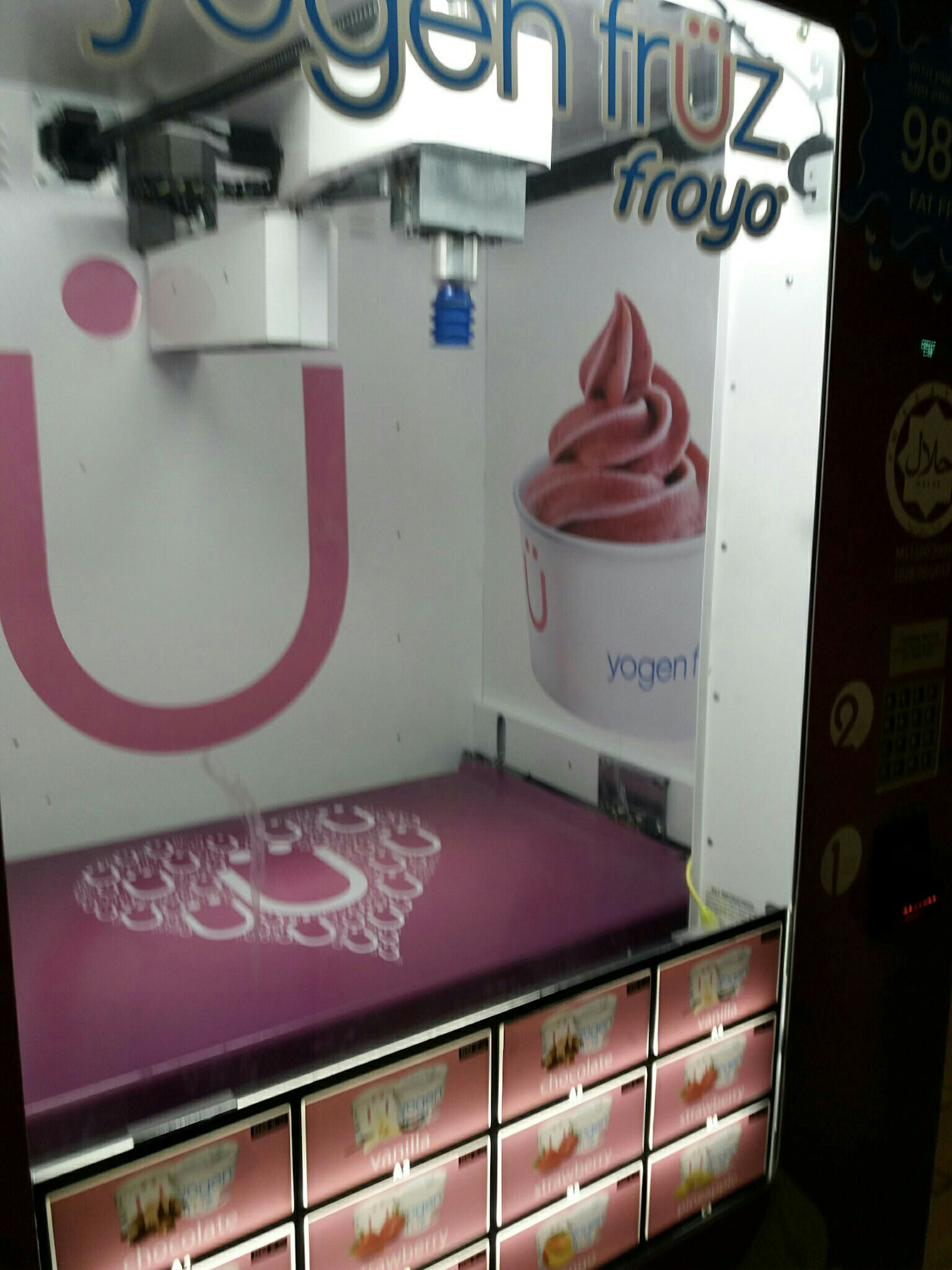 Wir haben in der Mall jede Menge Automaten gesehen: zum Beispiel für Katzenfutter… Was uns fasziniert hatte, war der Eisautomat. Nachdem wir unsere Sorte gewählt hatten und das Geld im Automaten war, klappte die Tiefkühltruhe auf und es kam von oben ein großer rüsselartiger Schlauch, der exakt am richtigen Eisbecher andockte und den Becher dann in die Schütte fallen ließ. Was für ein Jubel brach bei uns aus. Nun bekamen wir das Rückgeld heraus. Da wir nur größere Scheine hatten und einen 20 Ringit-Schein in den Automaten gesteckt hatten, bekamen wir nun jede Menge 1 Ringit-Scheine zurück. Das war fast wie beim Jackpotgewinn am Spielautomat!Wir hatten vielleicht einen Spaß beim Bestellen unseres Eises!